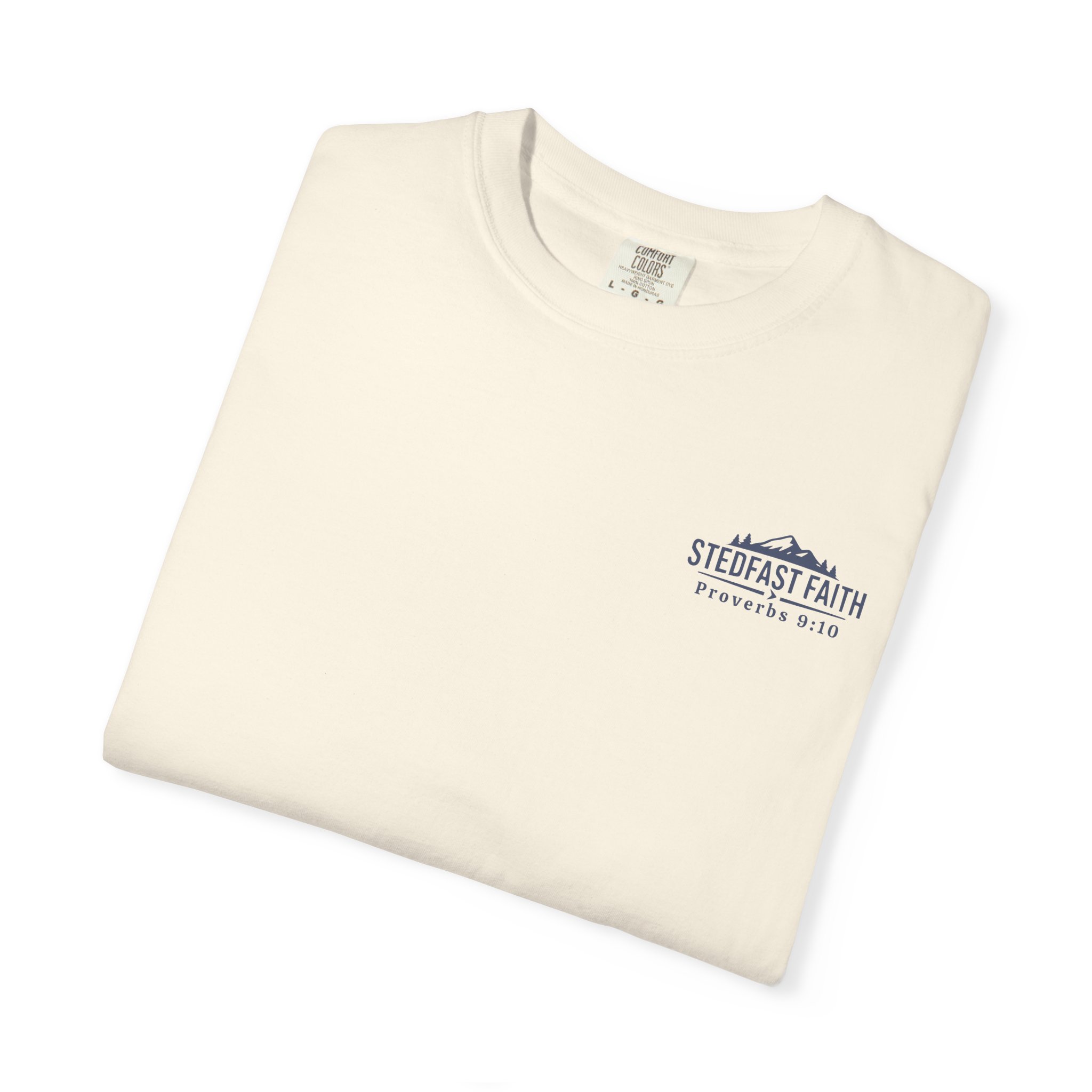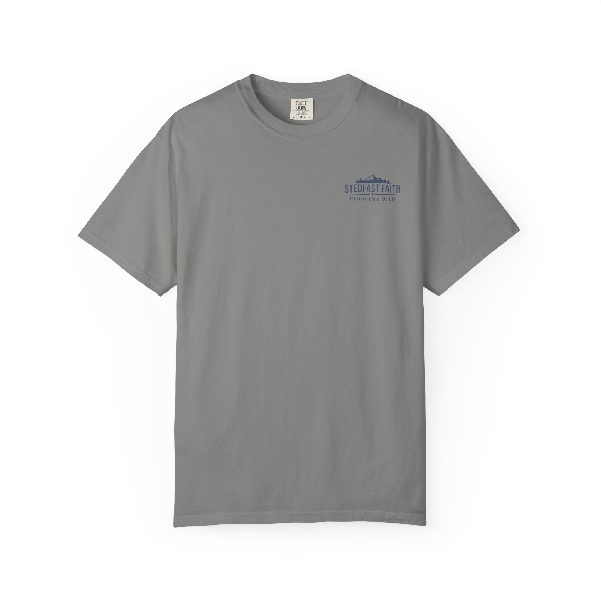 This heavyweight garment-dyed tee brings quiet, rustic comfort to everyday wear. The back-print shows a moonlit campfire scene—rolled blanket, travel mug, pine trees and a starry sky—framed by the phrase “The fear of the Lord” and Proverbs 9:10 beneath. The yarn-dyed softness of the fabric and the relaxed, roomy cut invite you to slow down: wrap up after an evening walk, layer it under a flannel for a worship night outdoors, or wear it to small-group gatherings where quiet reflection matters. The muted, vintage wash and sewn-in label give it an lived-in look that ages beautifully, so the message and the mood grow more personal with every wear.