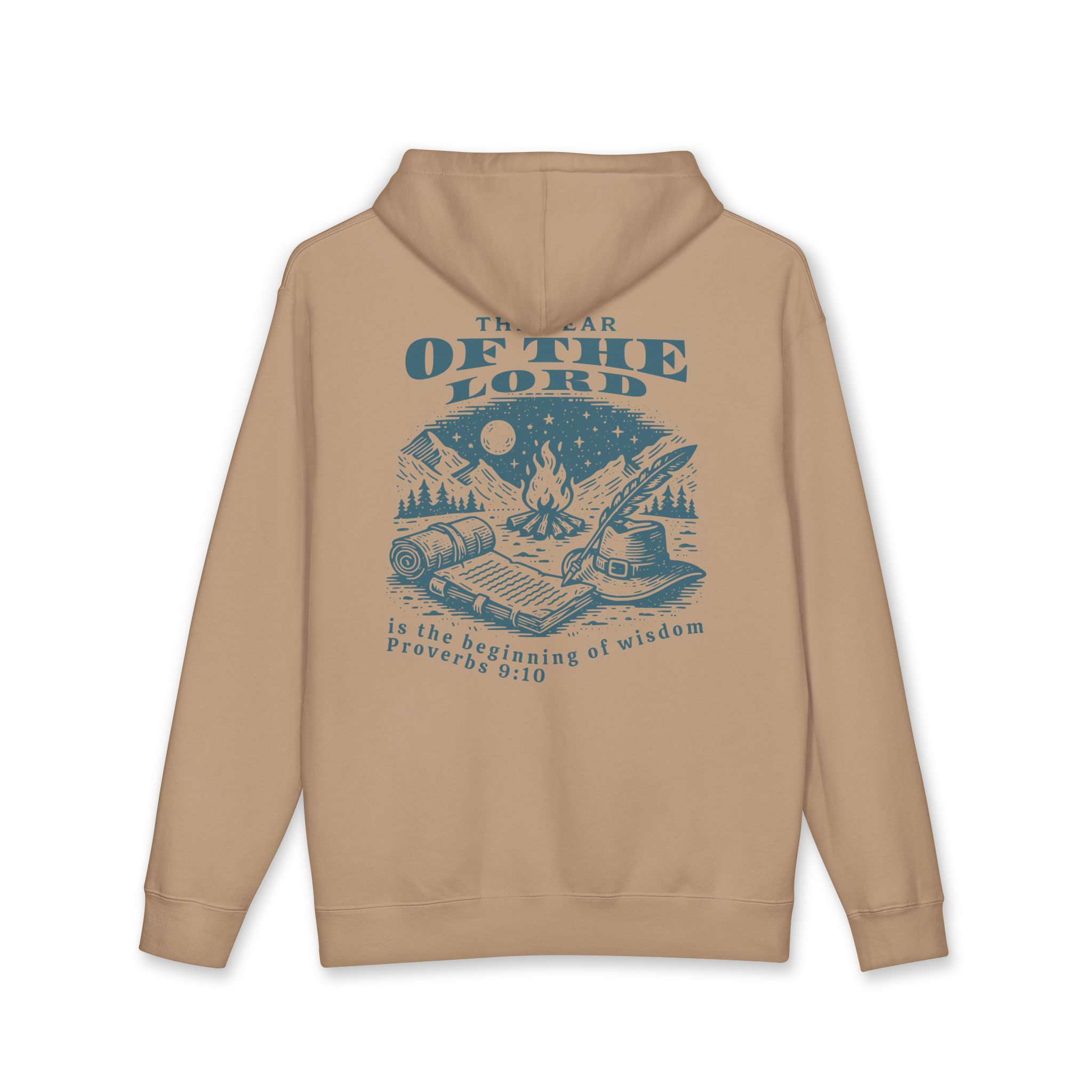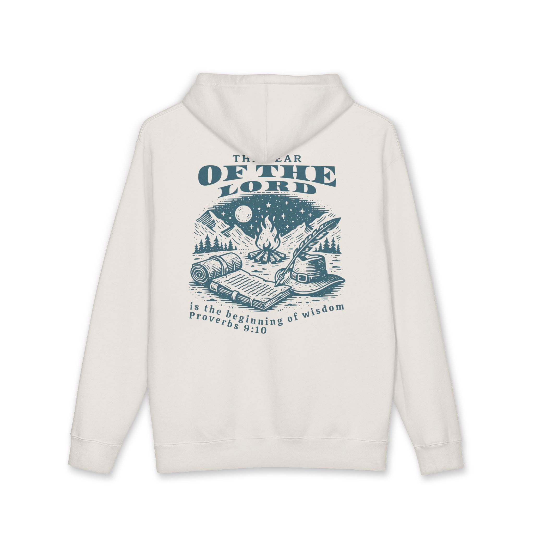 A heavyweight hooded sweatshirt built for quiet mornings by the fire and long evenings with a good book. The back features a vintage-style camp illustration and the phrase “The fear of the Lord is the beginning of wisdom — Proverbs 9:10,” rendered in a soft, muted ink that ages beautifully against the creamy fabric. The dense 10 oz fabric and fleece-lined hood hold warmth without bulk. Relaxed cut and ribbed cuffs let you layer over flannels or under a coat. Wear it to slow down, read, pray, or sit with friends around a campfire — it’s meant to feel familiar from the first wear and to carry the comfort of home and reflection wherever you go.